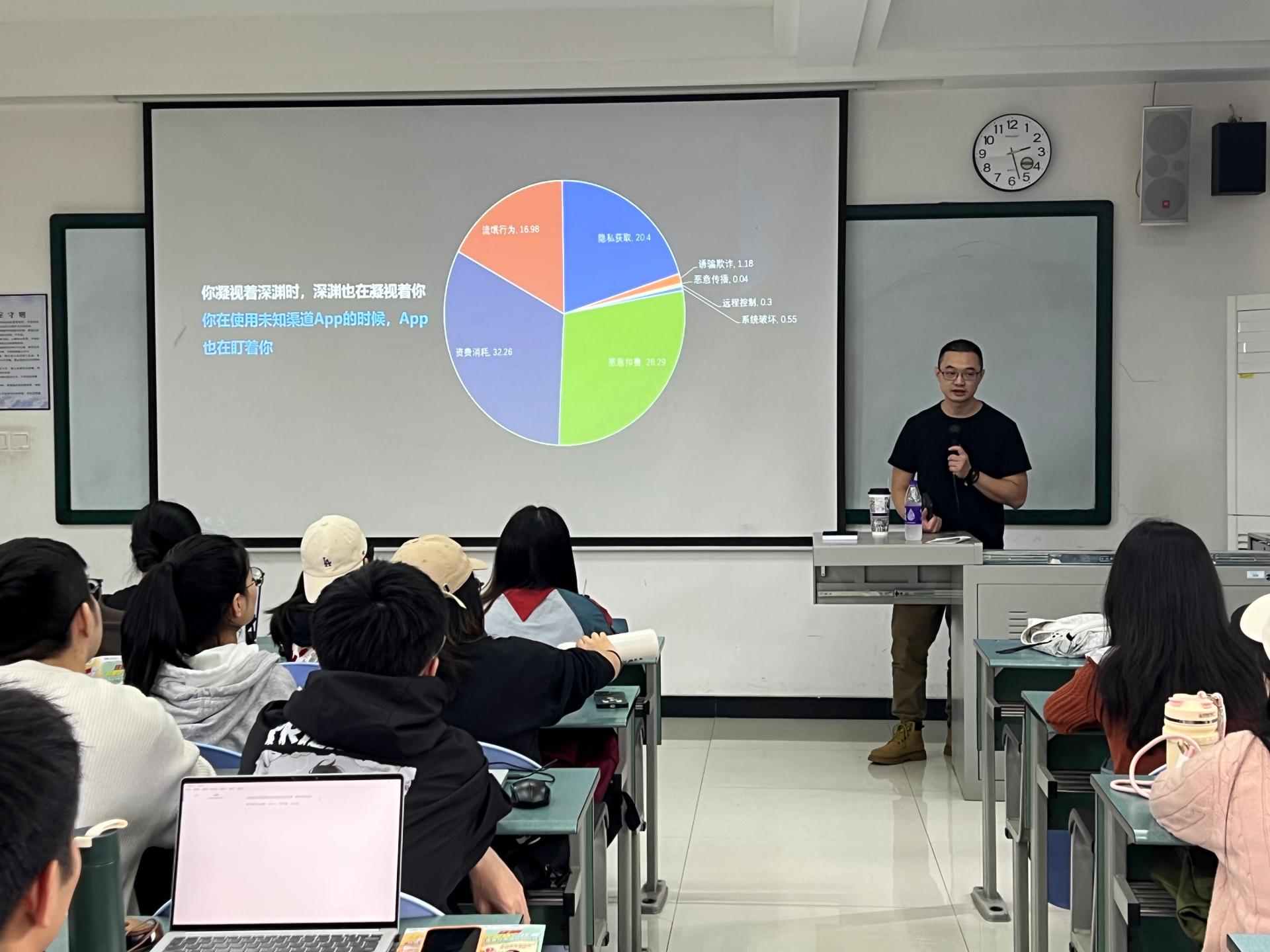 活动主讲人是新网银行风控科学部创新团队负责人陈少磊老师。围绕来自实务工作的多个案例,陈老师为同学们解读了网络黑产、电信诈骗等泛金融风险的来源和运作方式,并结合受诈借贷、疑似洗钱、异常交易等多个场景,展示了统计方法和数智技术如何助力风险防控、保障金融安全。陈老师在介绍中所展示的许多技术成果,正是在新网银行和统计学院持续多年的深度校企合作中逐步开发和长期积累的。