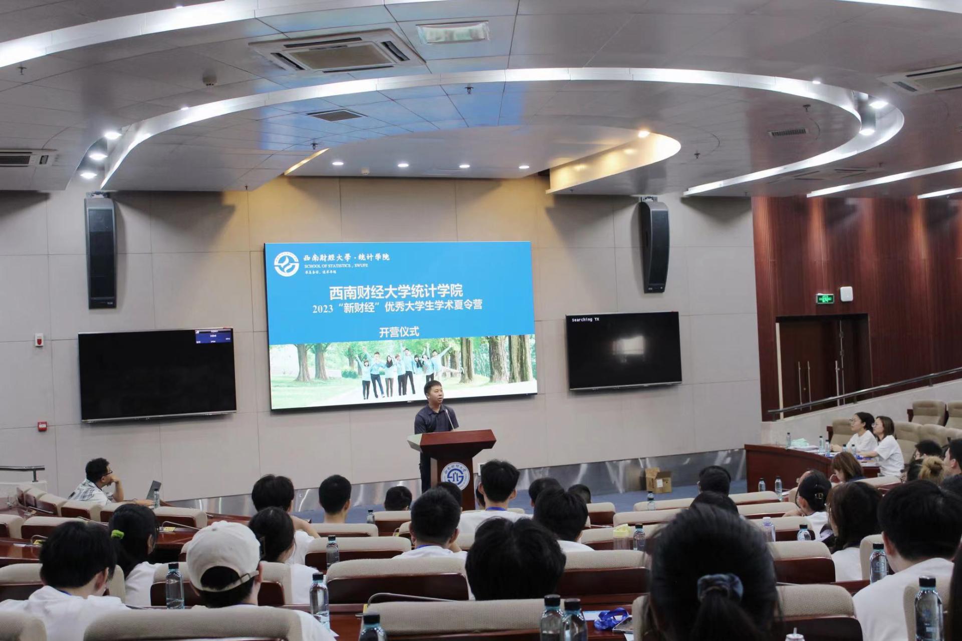 统计学院2023年“新财经”优秀大学生学术夏令营活动在柳林校区圆满举办。8日上午,统计学院“新财经”优秀大学生夏令营正式开营,学院院长郭建军教授,副院长兰伟教授,各系所负责人出席,活动特别邀请了行业专家司亚卿、陈少磊,优秀校友郭元绍、刘超参加。参加开营仪式的还有来自北京师范大学、重庆大学、西南交通大学、西南大学等30多所全国重点高校的72位同学,他们从235位夏令营申请者中脱颖而出,入选我院为期3天的2023年“新财经”优秀大学生学术夏令营活动。兰伟副院长主持开营仪式。