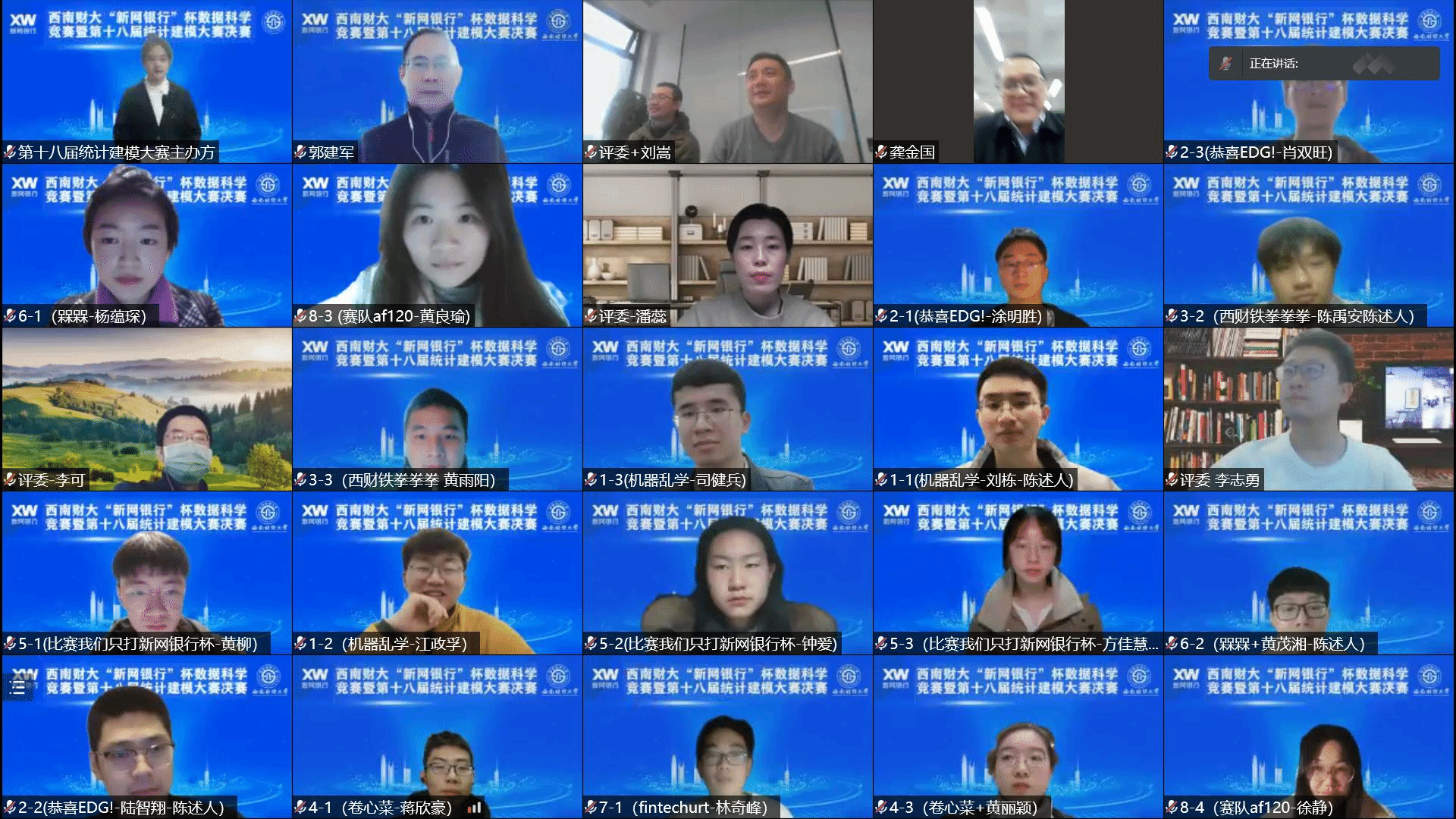 与四川新网银行联合举办的第十八届统计建模大赛决赛在线上举行。校党委常委、副校长李永强,新网银行风控科学部总经理刘嵩,教务处、经济管理实验教学中心、新网银行和统计学院有关负责人以及师生200余人参加了云端决赛。