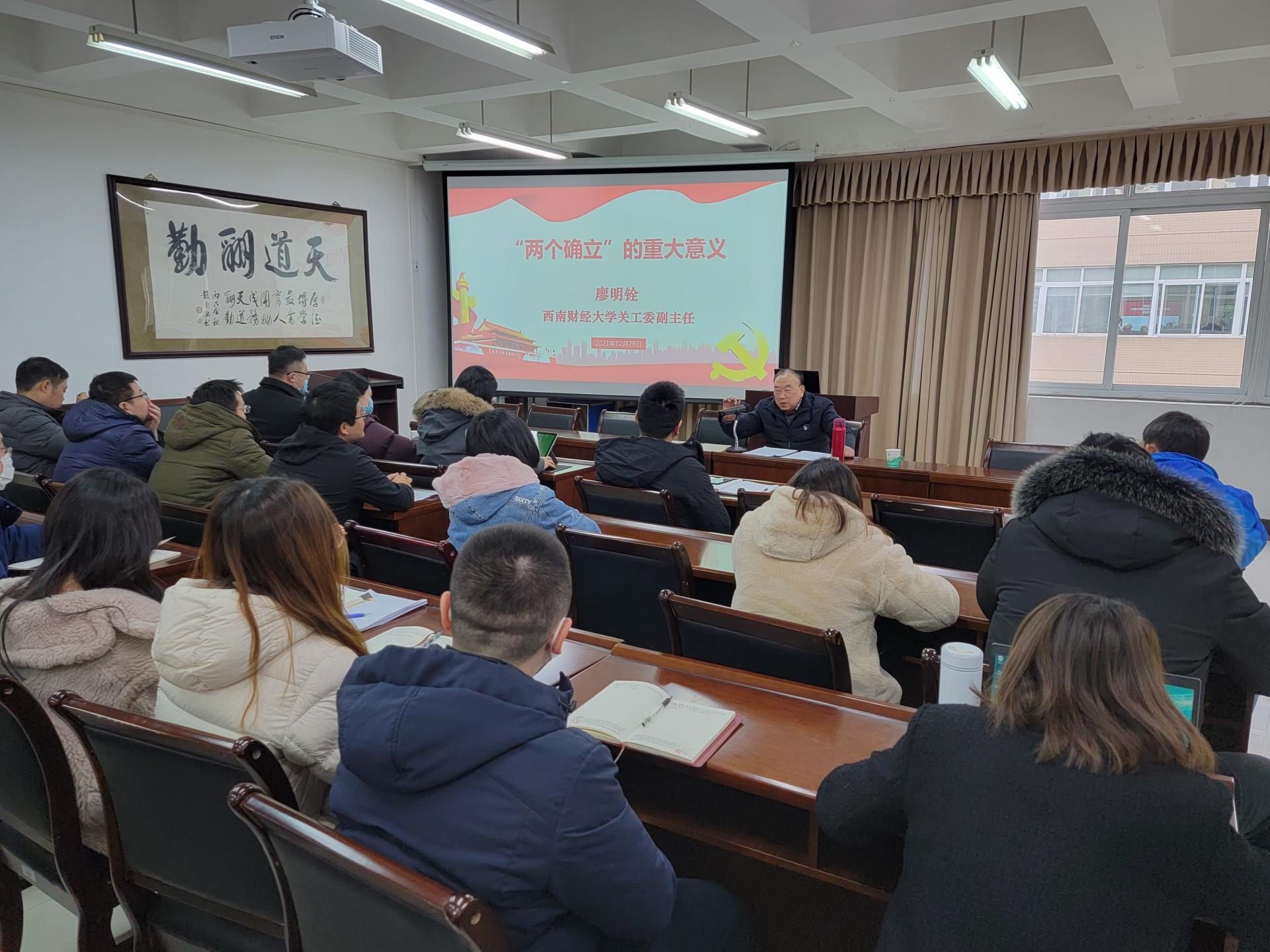 为深入学习贯彻党的十九届六中全会精神,巩固党史学习教育成果,统计学院特别邀请我校关工委副主任、原党委副书记廖明铨教授为统计学院和人文(通识)学院师生上了一堂专题党课,深刻领悟“两个确立”的重大意义。统计学院分党委书记黄海波主持党课。