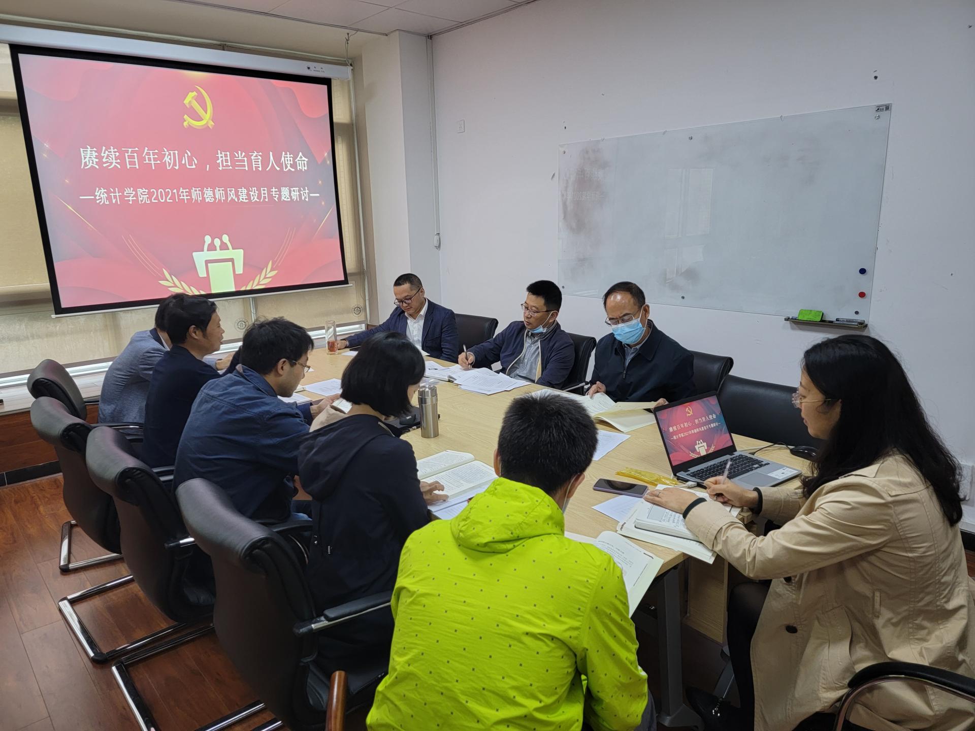 为落实学校师德师风建设月活动方案,统计学院于2021年10月12日上午在通博楼B101会议室开展师德师风建设专题研讨。学院分党委理论学习中心组成员参加会议,学院教师党支部书记、系所主任代表列席学习会。学院院长郭建军主持会议。