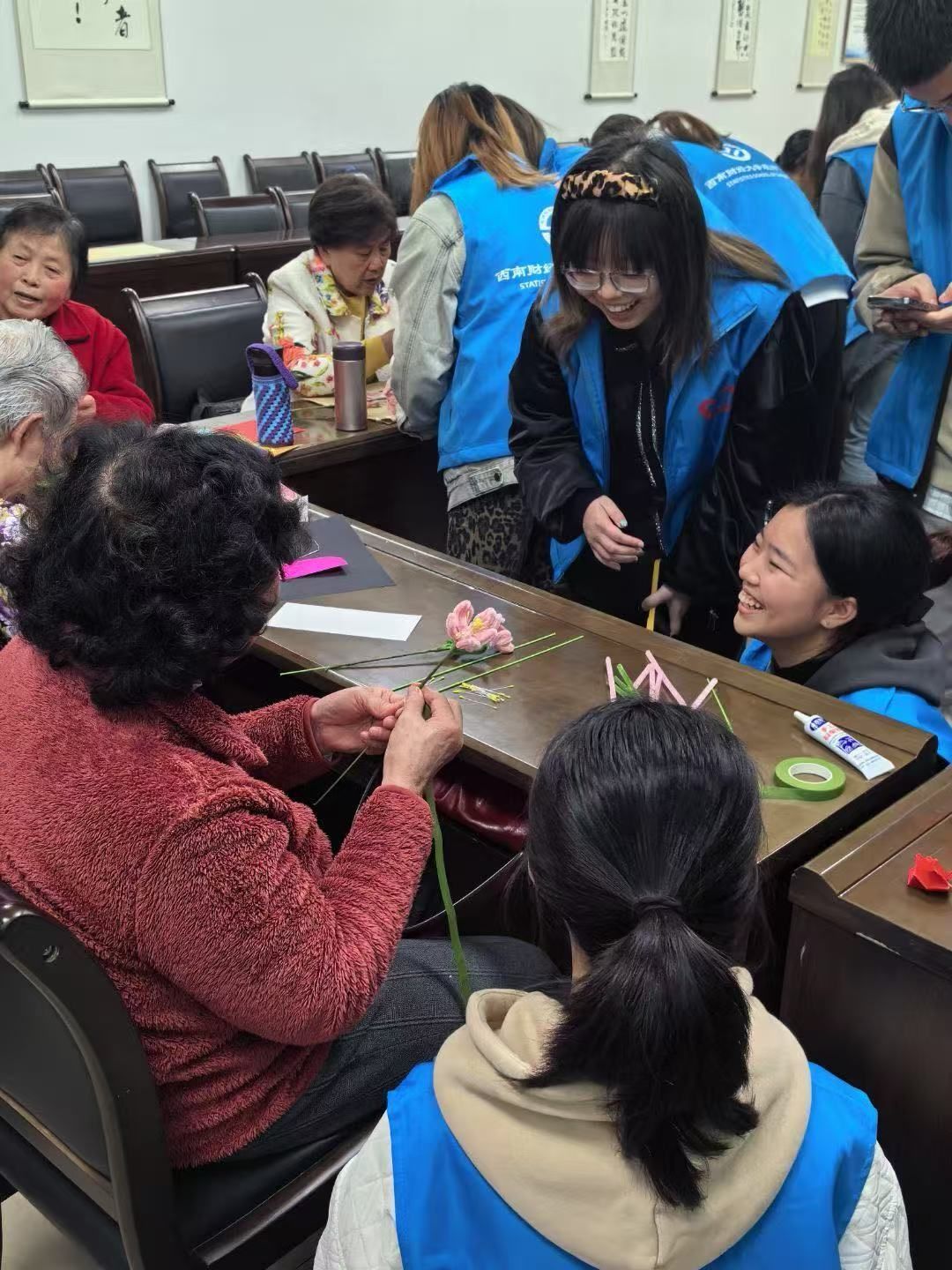 统计学院志工部于4月7日在光华校区离退休教职工活动中心成功举办了“老少携手,暖心光华”手工特别活动。此次活动旨在搭建代际沟通桥梁,通过创意手工互动促进青年学子与离退休教职工的情感交融,让年轻一代在实践体验与交流中深刻感悟西财百年校庆的主题内涵。活动现场,西财人齐聚一堂,在扭扭棒、书签等丰富多彩的手工创作中共话校史、畅想未来,欢声笑语中洋溢着浓浓的温情与感动。