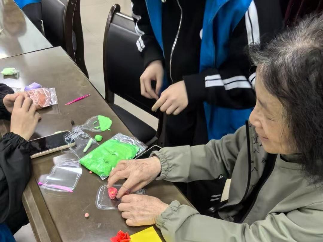 匠心独运组的志愿者们则与离退休教职工们共同创作黏土书签,指尖翻飞间,五彩斑斓的黏土被赋予新的生命,化作一枚枚独具匠心的艺术书签;