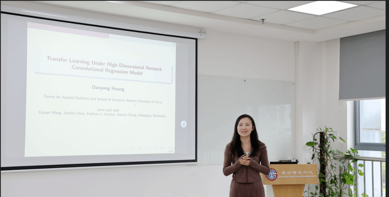 讲座中,黄丹阳教授深入探讨了网络化数据迁移学习中处理依赖关系的前沿问题。针对现有研究在独立设置下处理多种分布变化的迁移学习虽有进展,但在网络化数据依赖关系处理方面存在不足的情况,她提出了基于网络卷积回归(NCR)的高维迁移学习框架。该框架受图卷积网络(GCN)启发,通过让节点响应依赖自身及邻居聚合特征引入随机网络结构,有效捕捉局部依赖关系。同时,该方法包含解决源网络与目标网络领域偏移的两阶段迁移学习算法,以及识别信息量充足源域的源检测机制。在基于 Erdős–Rényi 模型假设的随机图理论框架下,黄丹阳教授分析了lasso估计器的性能,充分探讨了随机网络结构对于参数估计误差的影响,证明存在信息量充足的源域时,迁移学习能显著提高收敛速率。