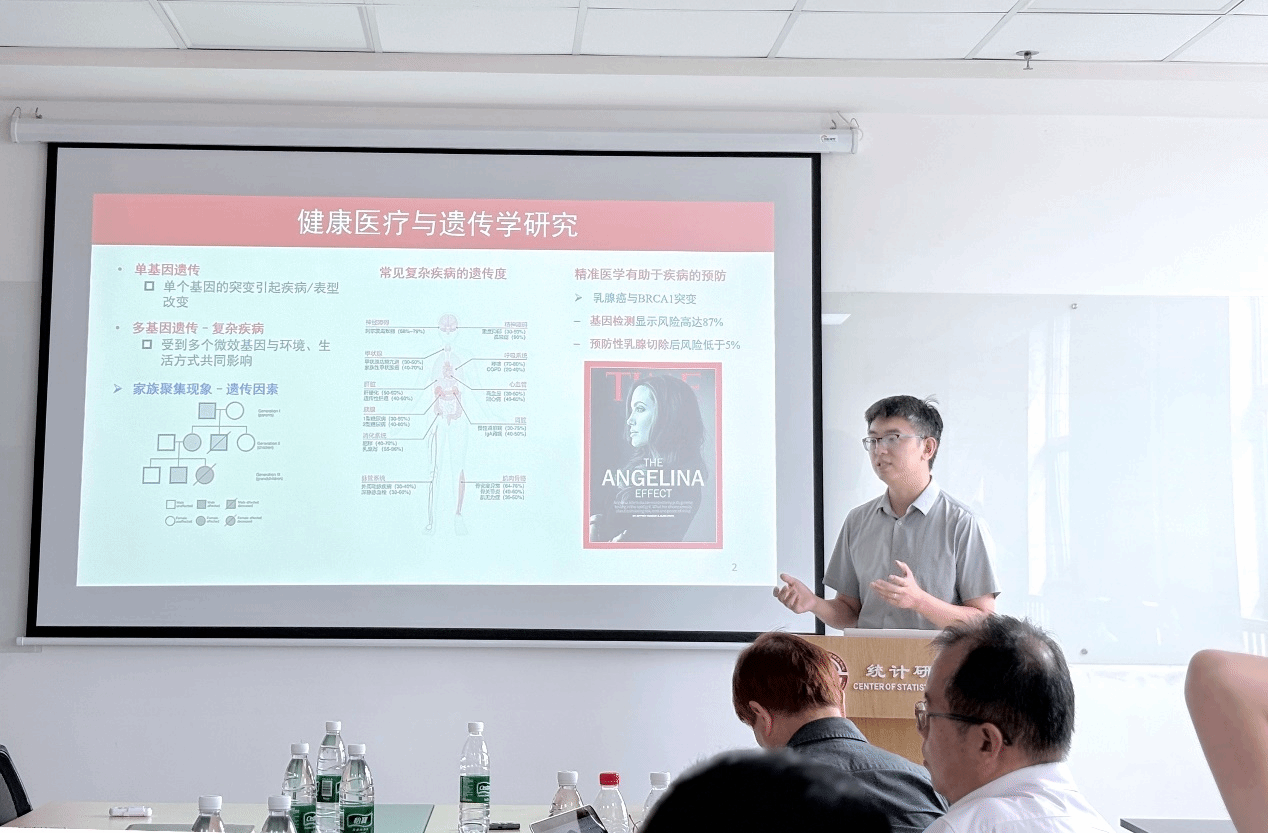 毕教授通过模拟研究和英国生物样本库(UK Biobank)实际数据分析验证了这些方法的优越性能。结果显示,新方法在保持高统计功效的同时能严格控制第一类错误率,有助于发现更多致病遗传位点。报告结束后,毕教授与在场师生就方法应用场景、计算效率优化等问题展开了深入交流。