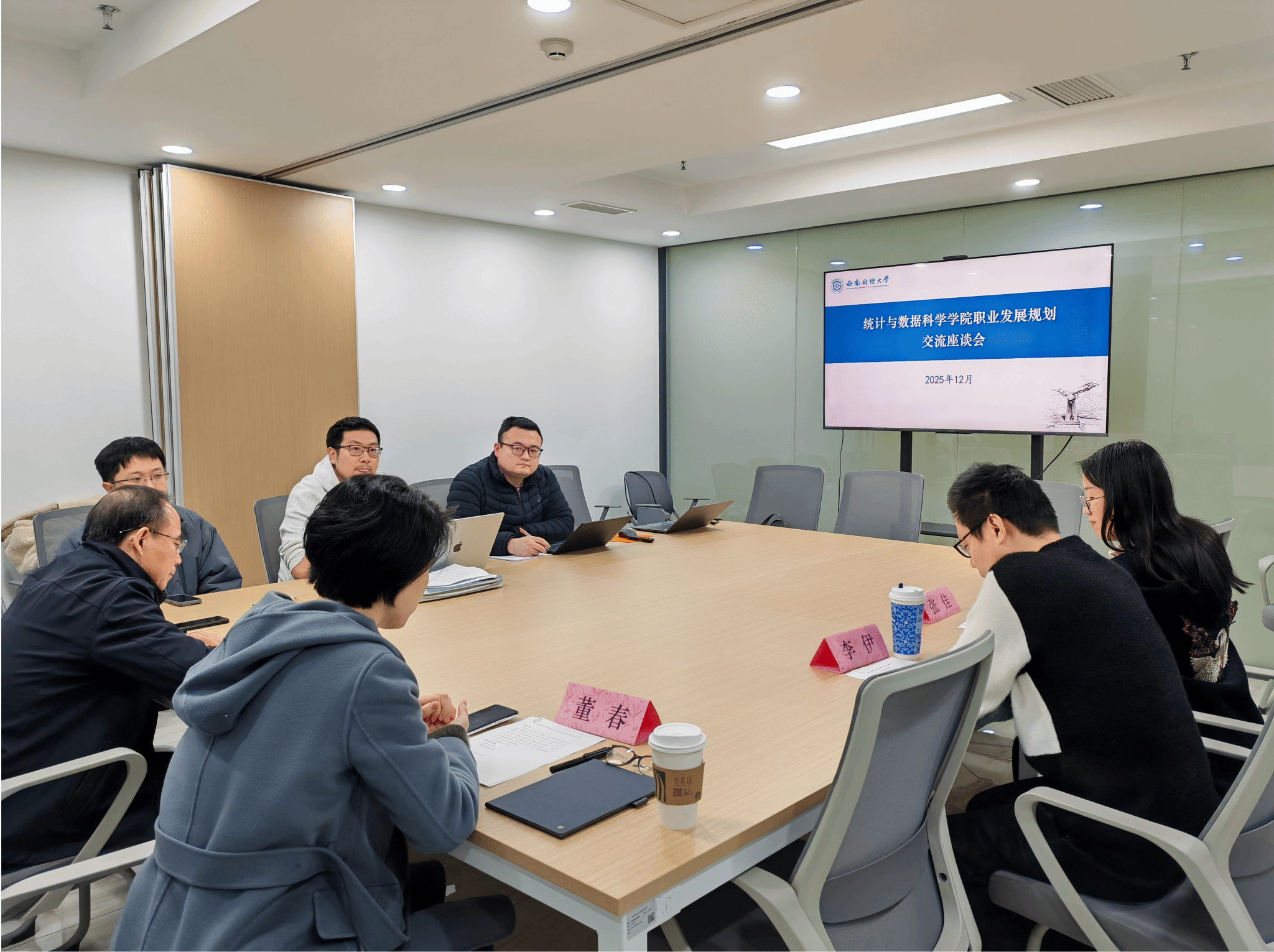 院长郭建军指出,新进教师要主动对接学院学科发展方向,积极融入专业建设与教学科研团队,希望青年教师立足统计与数据科学前沿,快速成长为推动学院高质量发展的新生力量。党委书记董春谈到,新进教师要将个人成长融入学院发展大局,在立德树人和科研创新中彰显责任担当,要积极参与学院各项工作,为学院建设一流学科贡献智慧和力量。