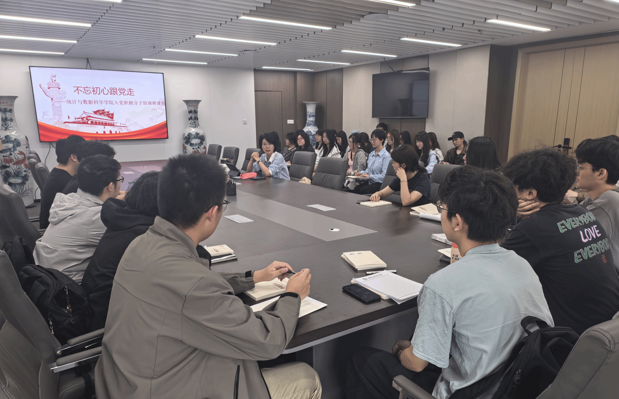 入党积极分子培训班于下午三点半在诚正楼1320开班。本次培训由学院党委书记董春主讲,第114期入党积极分子培训班全体学员参加学习。