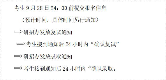 5. 获得拟录取资格的申请人务必于9月28日24:00前(预计时间)登陆教育部“全国推荐优秀应届本科毕业生免试攻读研究生信息公开暨管理服务系统”填写并提交报名信息。并按照如下程序完成录取确认,逾期未确认将视为自动放弃录取资格。