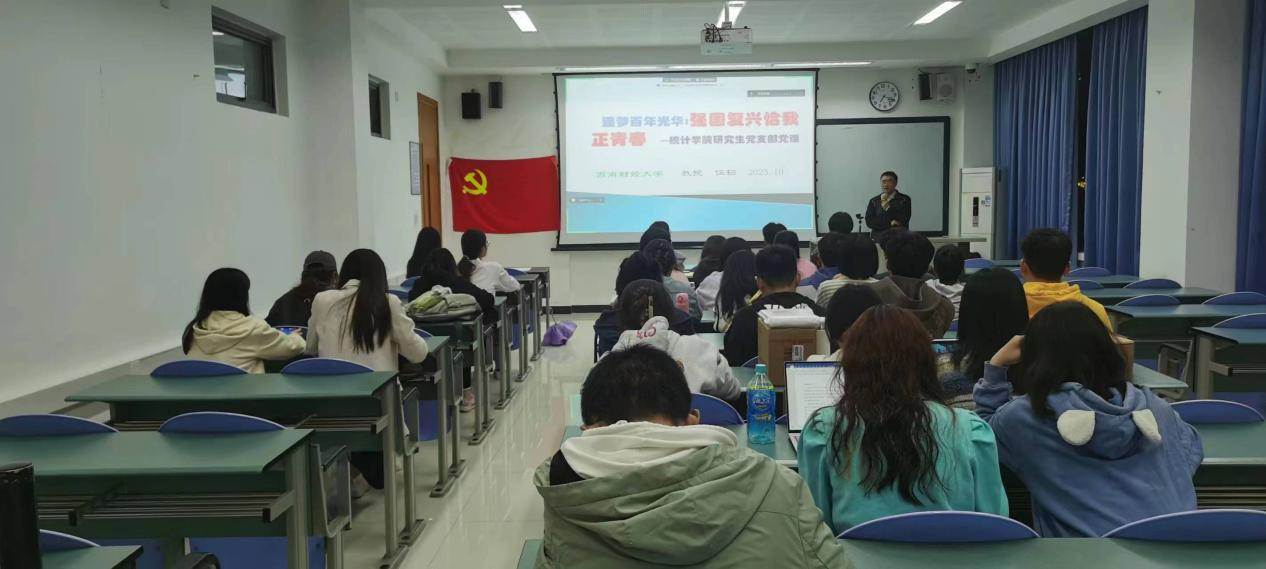 2023年10月26日晚,离退休党支部书记伍韧教授为统计学院研究生第四、七党支部的党员上了一堂以“逐梦百年光华:强国复兴恰我正青春”为主题的党课。作为研究生第四、七党支部与离退休党支部交流共建的重要内容,此次主题教育党课加强了支部间的联系。同时正值迎接百年校庆,此次邀请到伍韧教授为学生党员讲党课,让学生党员强化了强国复兴的责任感和青春奋斗的使命感。