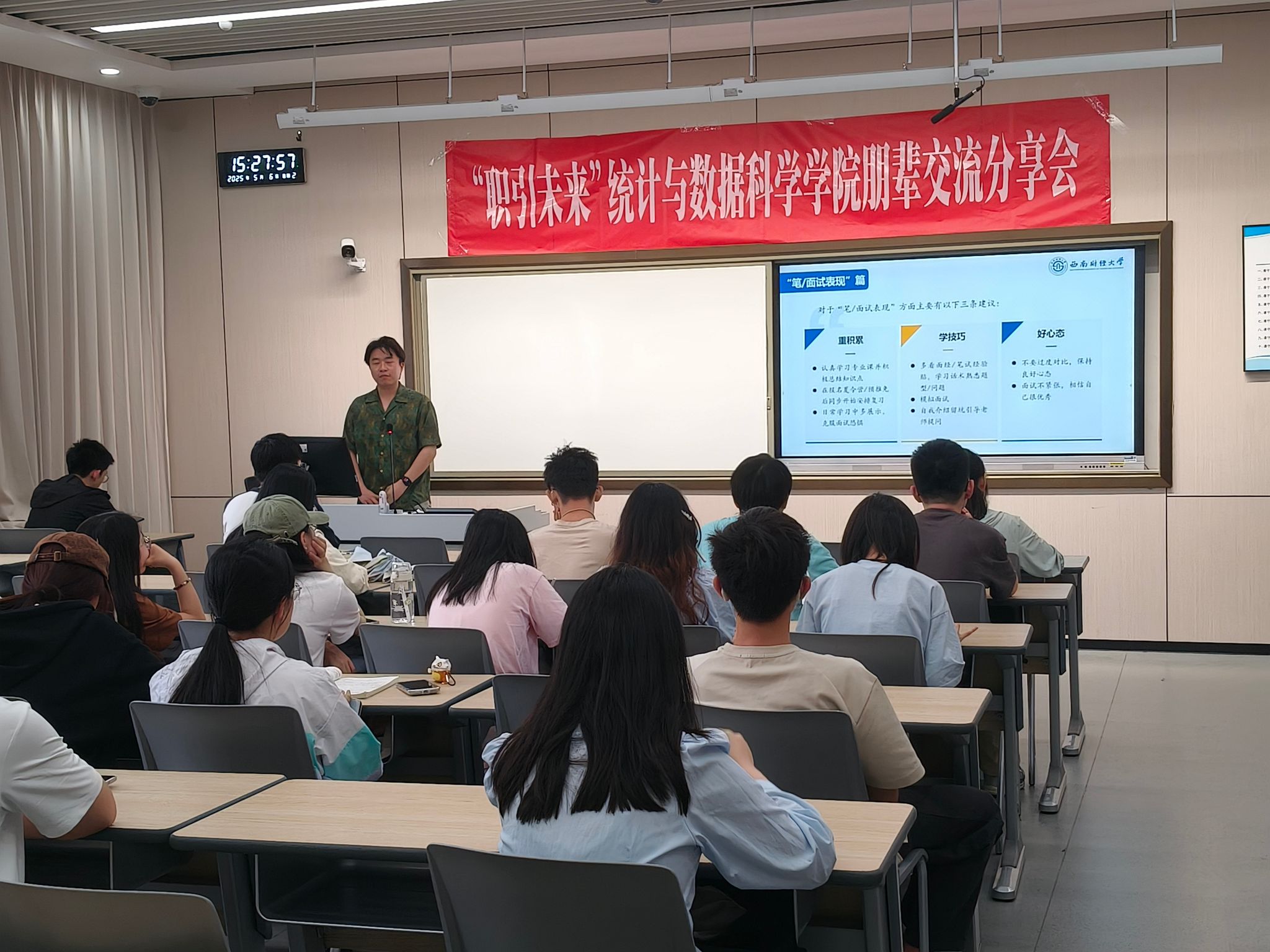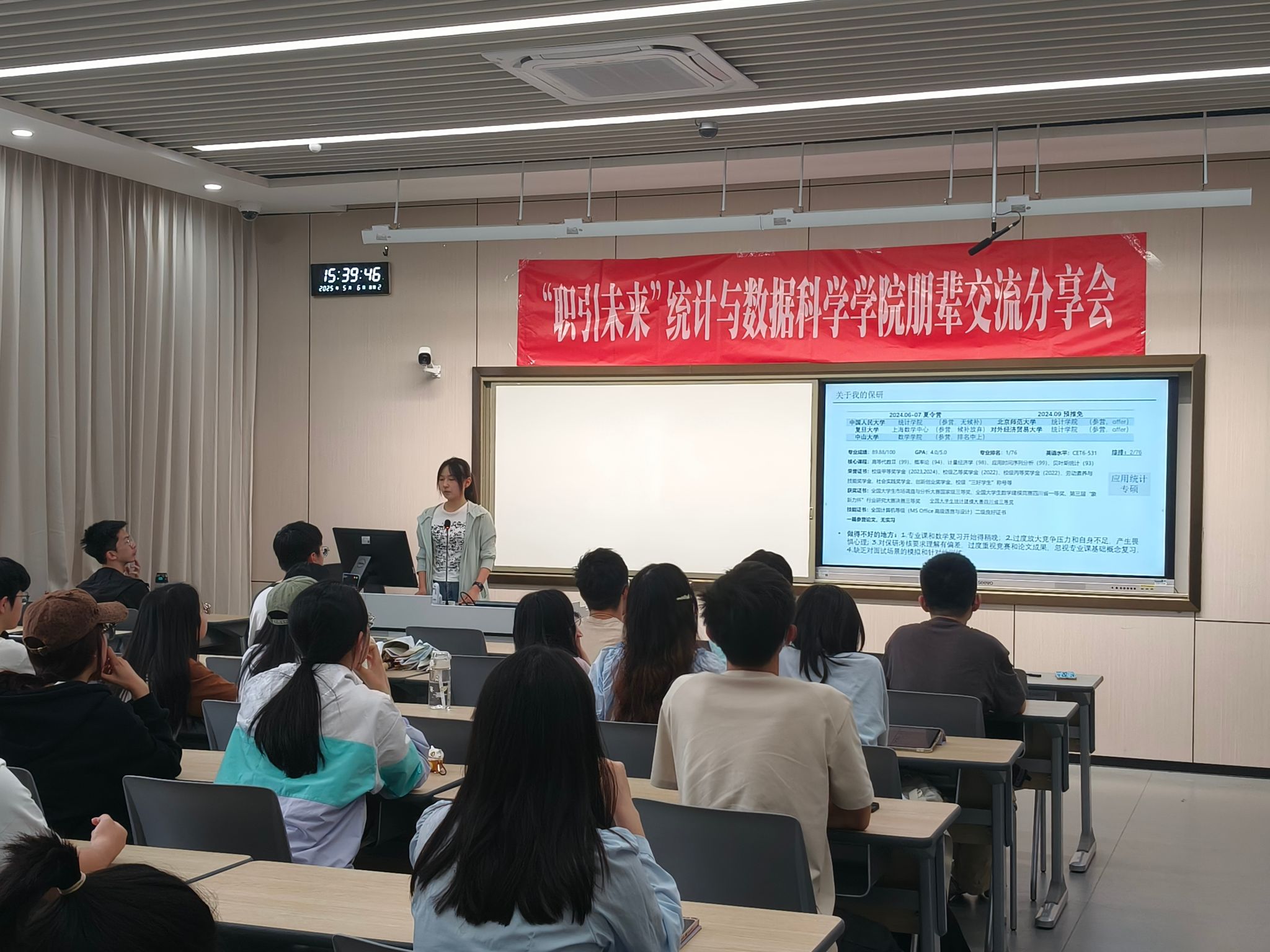 于经世楼C208举办“职引未来”朋辈交流分享会保研专场活动。本次活动邀请到两位成功保研的统计学子,倾囊相授保研经验,吸引了学院40余名学生参加,现场交流氛围热烈。