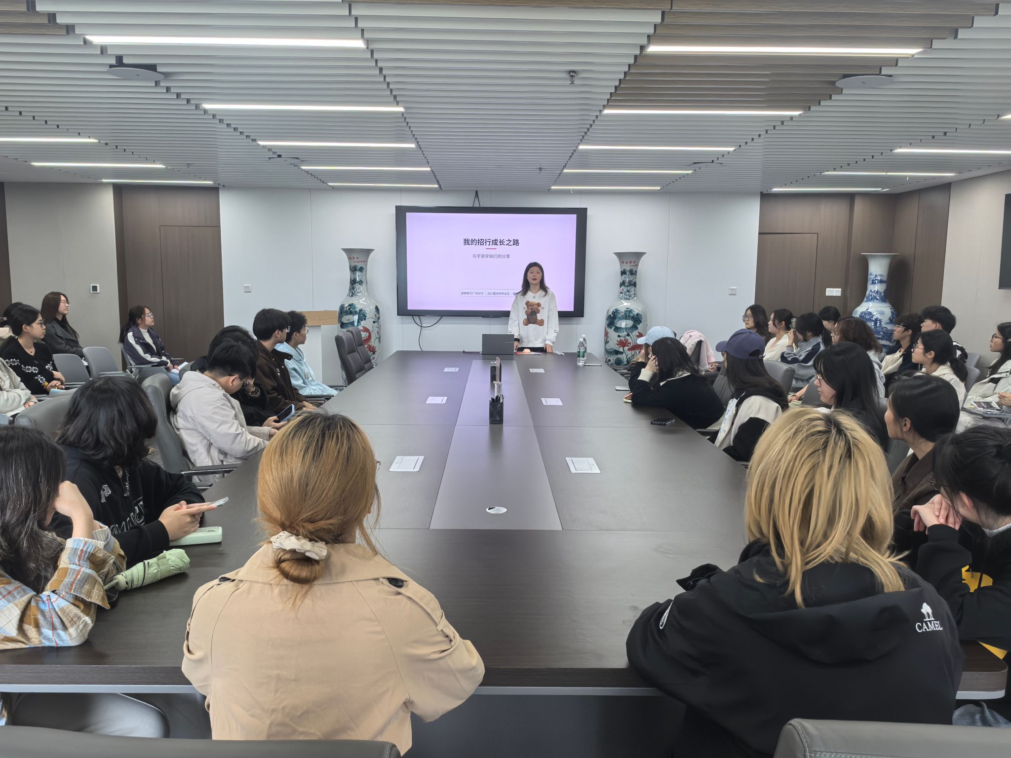 本次活动还邀请到招商银行广州分行人力资源部负责人卢总莅临现场。面对同学们在职业规划与就业选择中遇到的困惑,她结合行业现状与人才需求,鼓励同学们提升自己的主动性、抗压性与共情力。同时,她认为选择本科就业或是硕士就业都有自己独特的优势,人生有很多机会,关键在于把握当下。