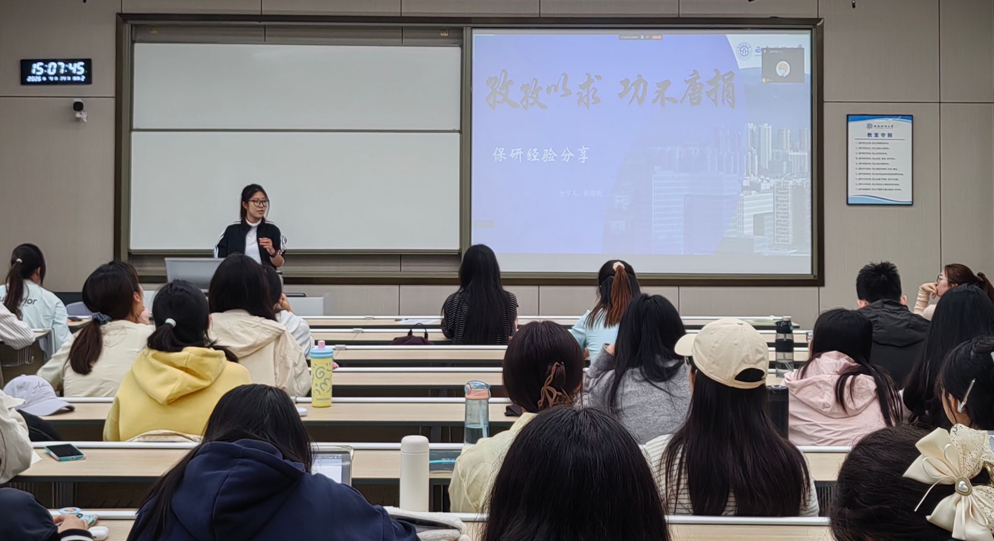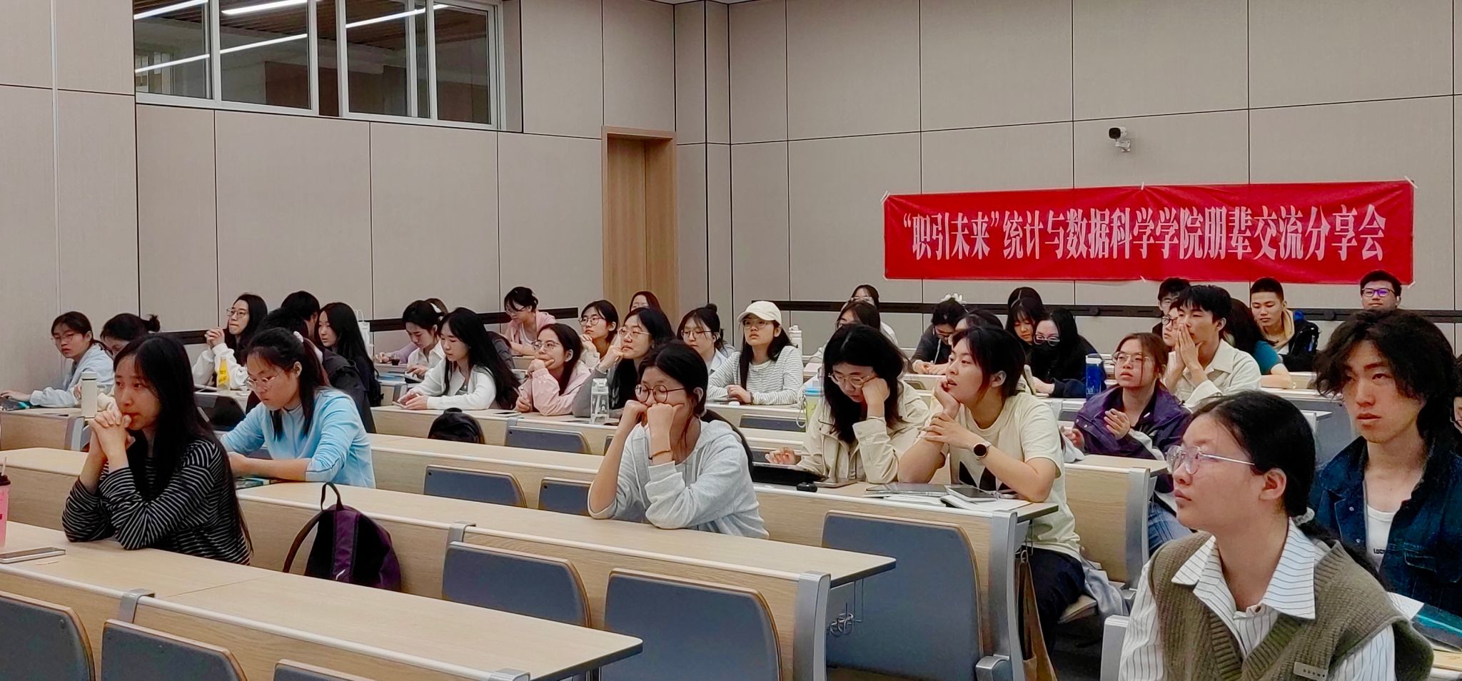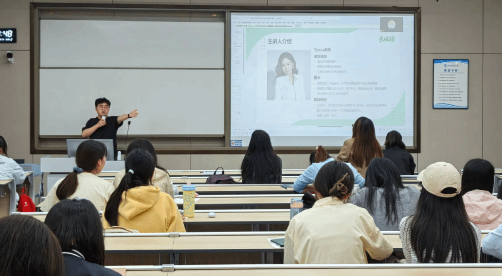 于颐德楼H109举办“职引未来”朋辈交流分享会保研专场活动。本次活动特邀学院两位已成功保研的优秀学子与高顿教育专业导师联袂分享,为在场同学带来全流程的保研经验指导,吸引了学院80余名同学参加。