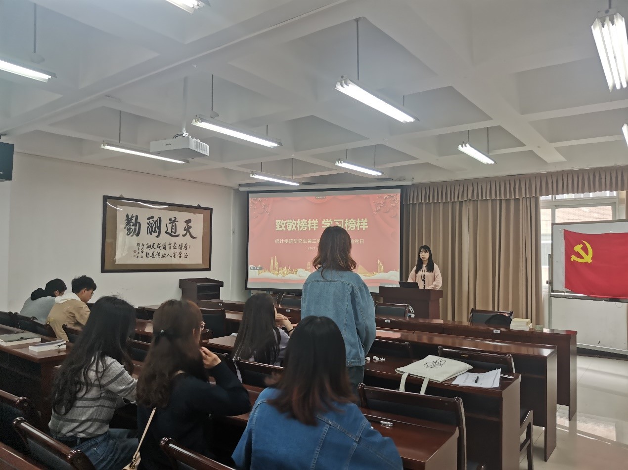 为充分发挥榜样引领作用,进一步深化党员党史学习教育,深刻体会伟大抗疫斗争精神,2021年4月24日上午十点,统计学院研究生第三党支部在通博楼B212会议室开展了“致敬榜样,学习榜样”主题党日活动。活动由支部副书记来倩主持,支部党员参加。